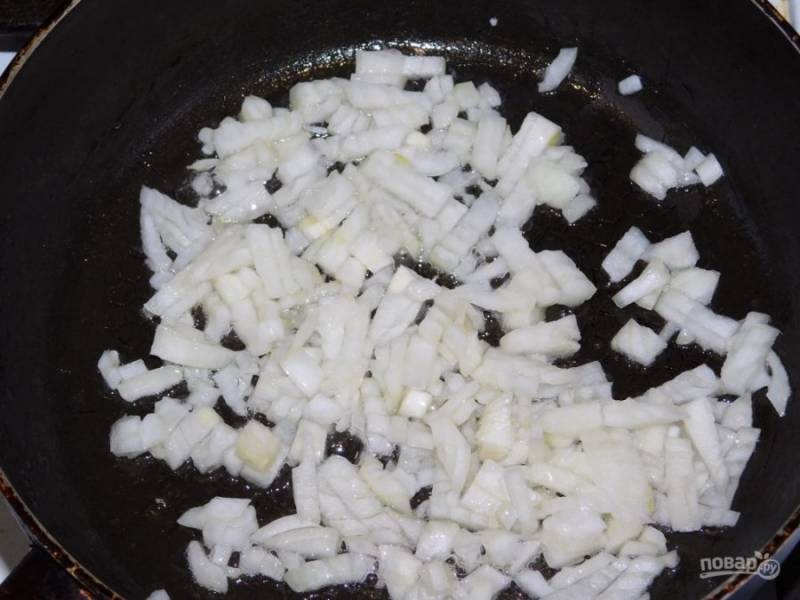 Первым делом мелко нарежьте лук и обжарьте его до золотистого цвета.