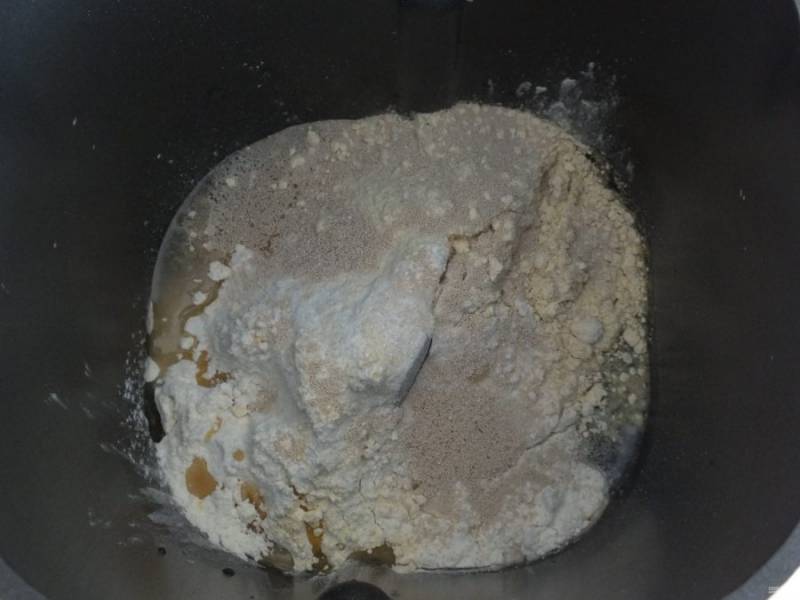 Выберите способ замеса. В моем случае, с помощью хлебопечки. Погрузите продукты в ведерко согласно вашей инструкции. Включите программу "тесто", по времени 1 час 04 мин. По завершении программы оставьте тесто на 30 минут. Если вы замешиваете ручным способом, то в теплой воде растворите соль, сахар, дрожжи и добавьте обе муки, в конце растительное мало. Как только тесто собралось в комок, накройте и уберите в теплое место на 1 час 20 мин.
