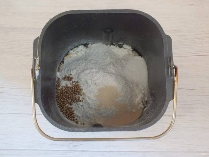 Добавьте муку ржаную, пшеничную, соль, сахар, дрожжи и зёрна кориандра. Включите режим "Специальный", по времени 3 часа 40 минут.