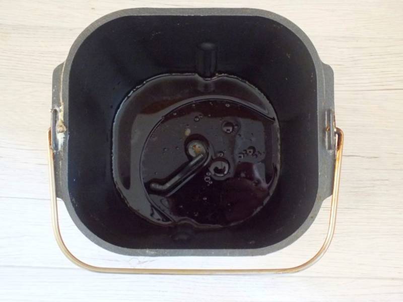 В ведерко хлебопечки вылейте квас и растительное масло.
