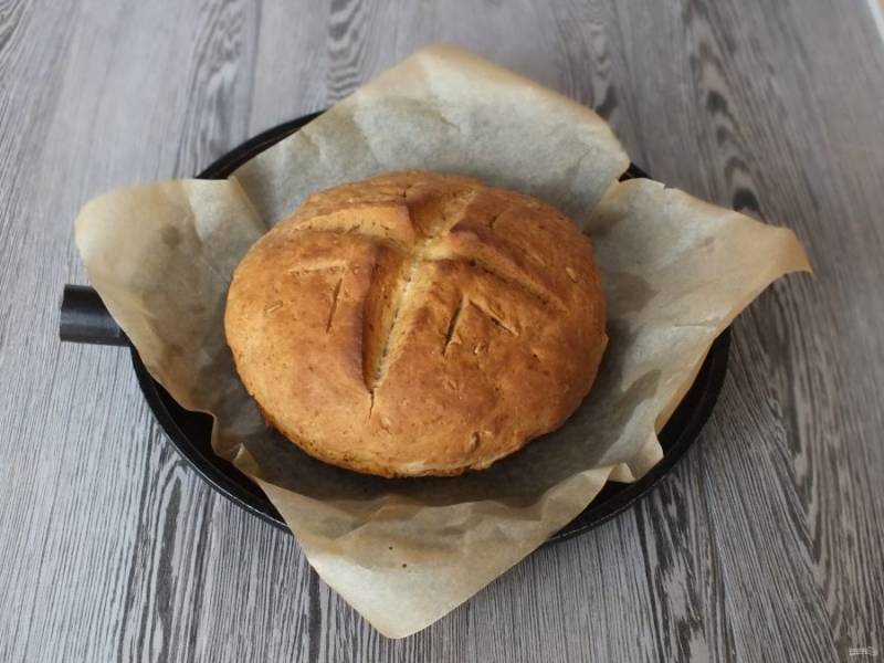 По истечении времени, проверьте хлеб на сухую палочку и постучите по корочке. Если звук глухой, хлеб готов. Если сомневаетесь, убавьте огонь до 150 градусов и выдержите еще 10 минут, но не передержите, обычно указанного времени вполне хватает. Хлеб охладите.