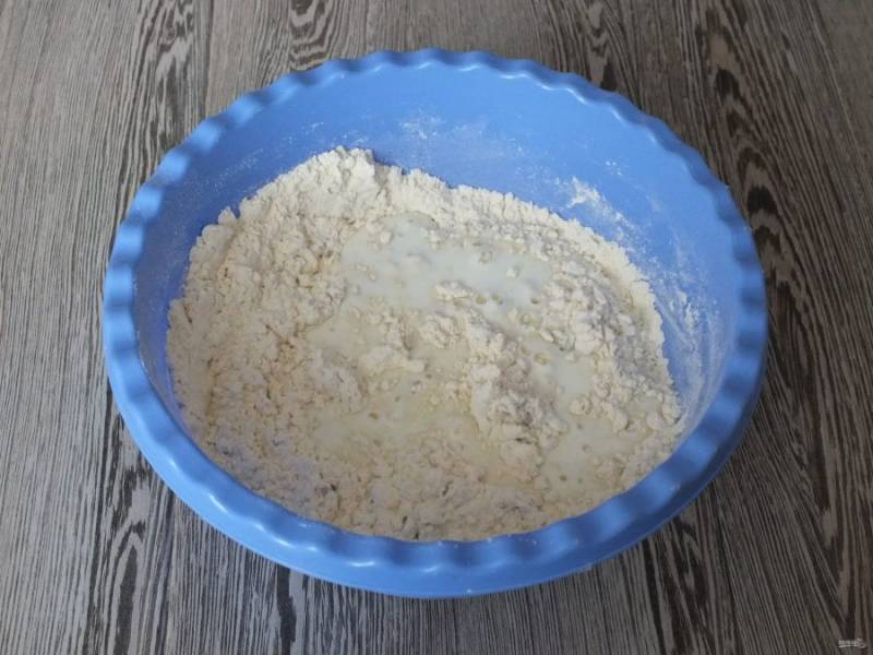 Добавьте теплый кефир и замесите тесто.