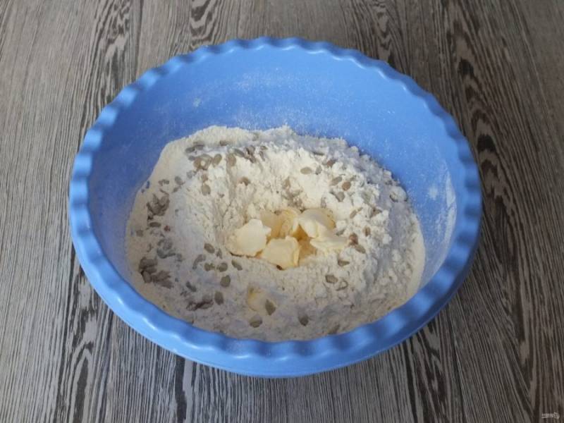 Добавьте соль, семечки и мягкое масло. Тщательно разотрите масло с мукой.
