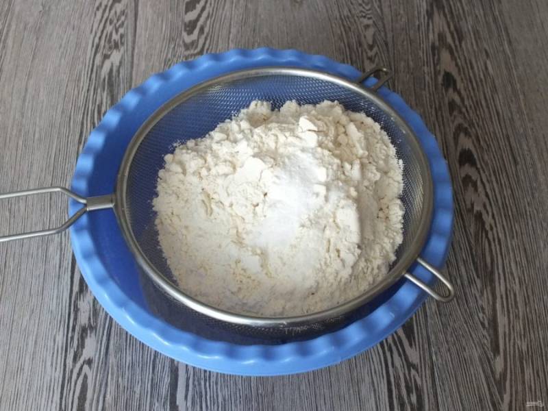 В чашу просейте муку с содой.
