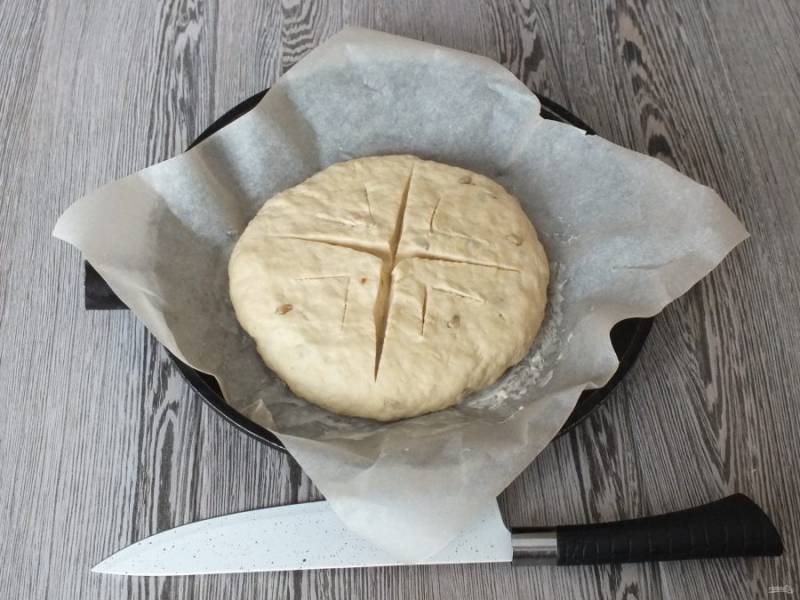 Форму для выпечки застелите пищевым пергаментом и смажьте маслом. Тесто округлите, слегка раскатайте скалкой, ориентируйтесь на диаметр 20 см. Переложите в форму. Острым ножом сделайте глубокие надрезы (глубина 0,5 см.). Поставьте в разогретую до 180 градусов духовку на 45-50 минут.