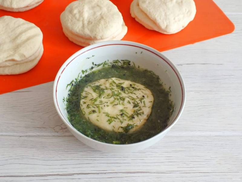 Каждую лепешку окуните в растопленное масло с укропом. Слегка стряхните лишнее масло.