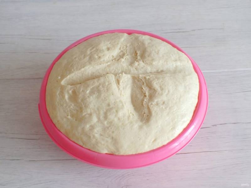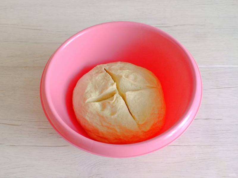 Округлите тесто, выложите в миску смазанную растительным маслом. Сделайте крестообразный разрез, затяните пленкой, прикройте полотенцем. Уберите чашу с тестом в теплое место на 2 часа.