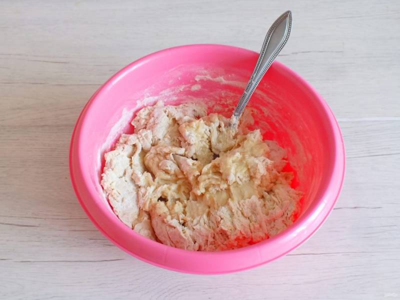 Начните замес ложкой. Добавьте растительное масло и месите руками. Тесто хорошо будет собираться в комок.