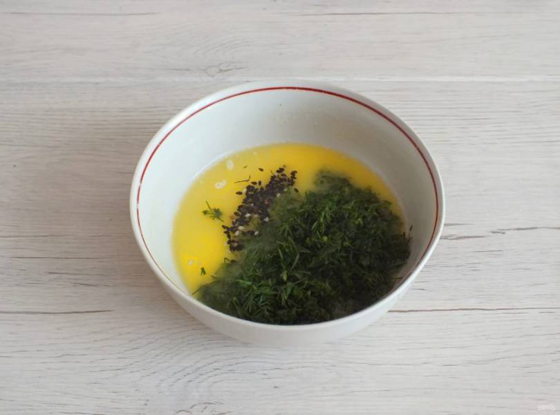 Растопите 100 грамм сливочного масла. Добавьте в него кунжут, нарезанный мелко укроп. Перемешайте.