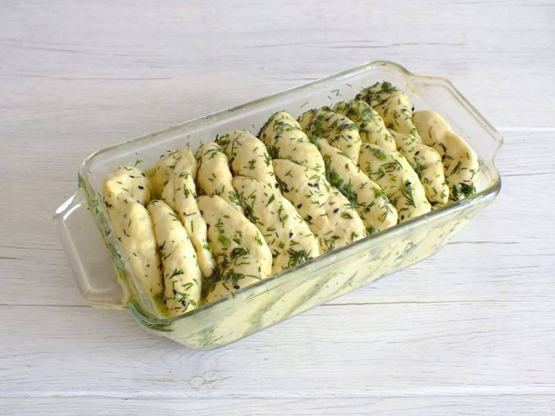 Возьмите прямоугольную форму. Смажьте тонким слоем сливочного масла. Каждую лепешечку укладывайте внахлест, в два ряда. Когда заполните форму, верх слегка прижмите ладонью, чтобы будущий хлеб имел ровную поверхность. Прикройте форму полотенцем и оставьте на 20 минут. За это время разогрейте духовку до 180 градусов. Через 20 минут поставьте выпекаться хлеб на 30-35 минут.
