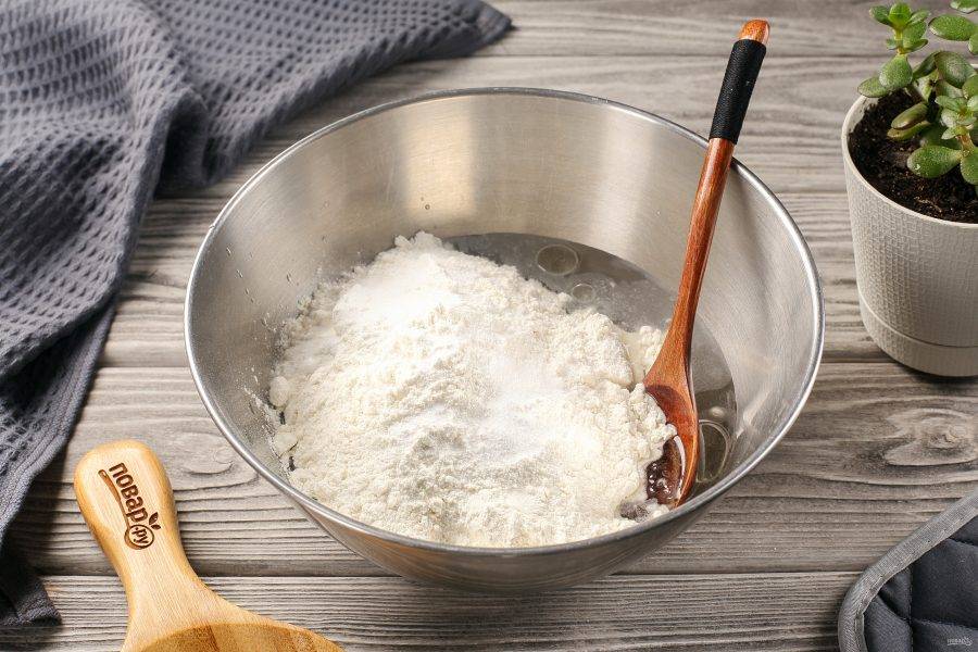 Добавьте соду, перемешайте и частями введите просеянную муку.