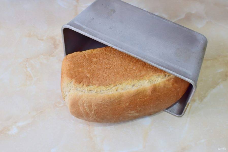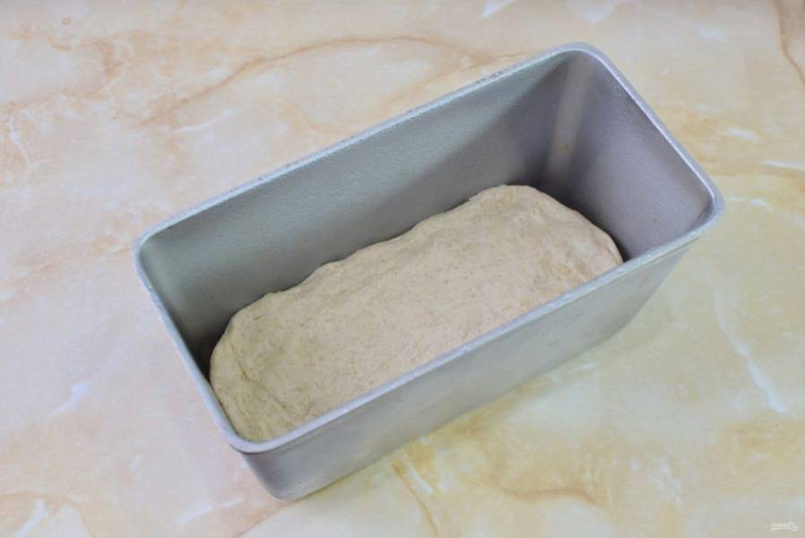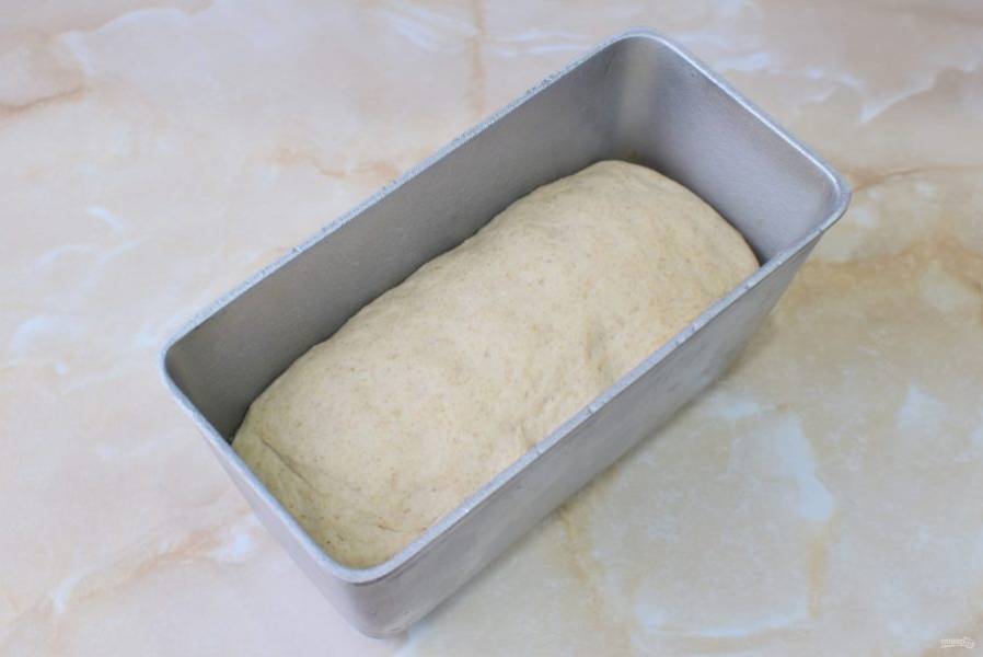 Форму для хлеба смажьте растительным маслом. Выложите в неё тесто. Оставьте в тепле еще минут на 15-20. Если формы нет, то хлеб можно сделать просто круглым.