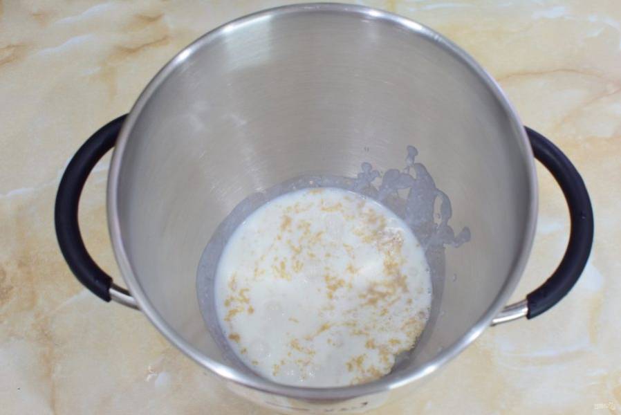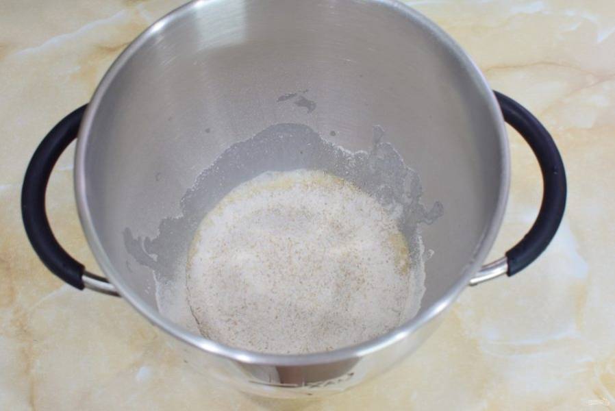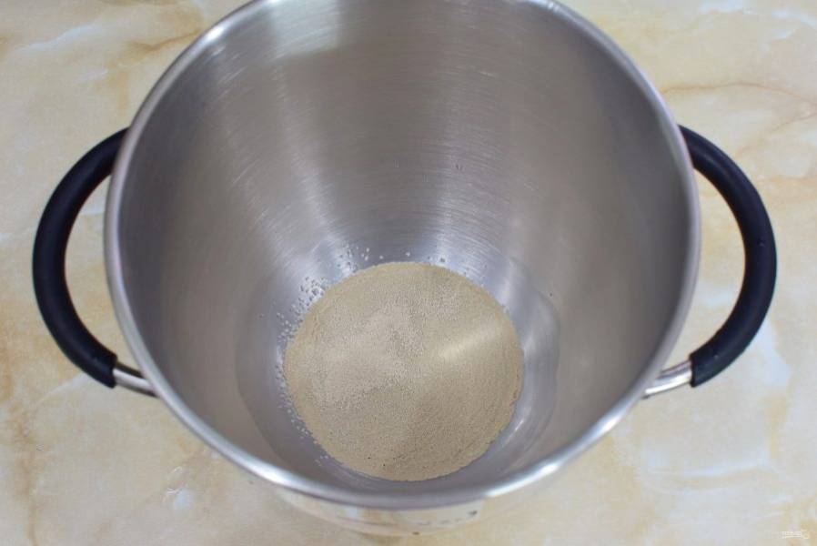 В чашу для теста налейте теплую воду и всыпьте сухие дрожжи.