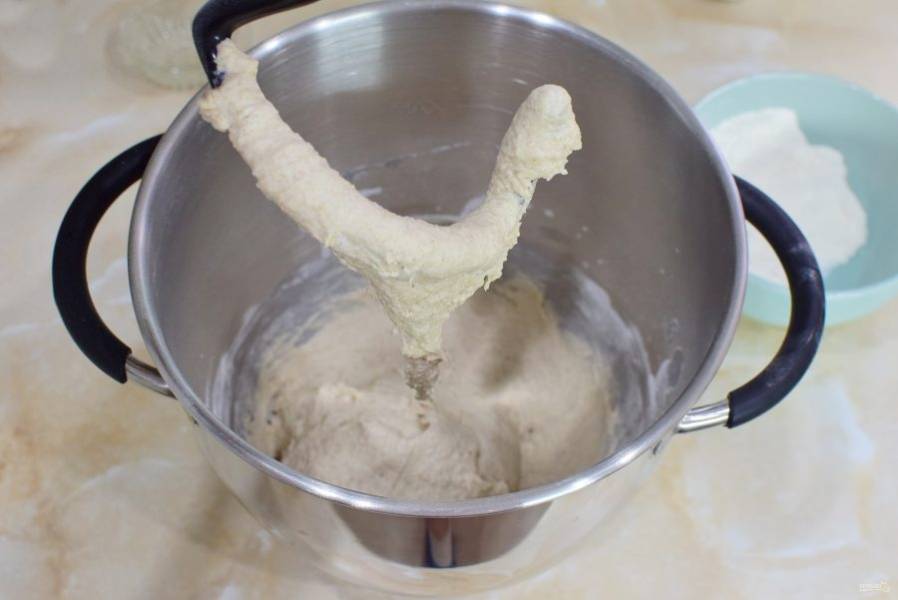 Замесите тесто. Теперь постепенно подсыпайте оставшуюся муку. Постепенно тесто станет плотное и однородное. Но почти не будет липнуть к рукам. Смажьте руки растительным маслом и слепите тесто в комок.