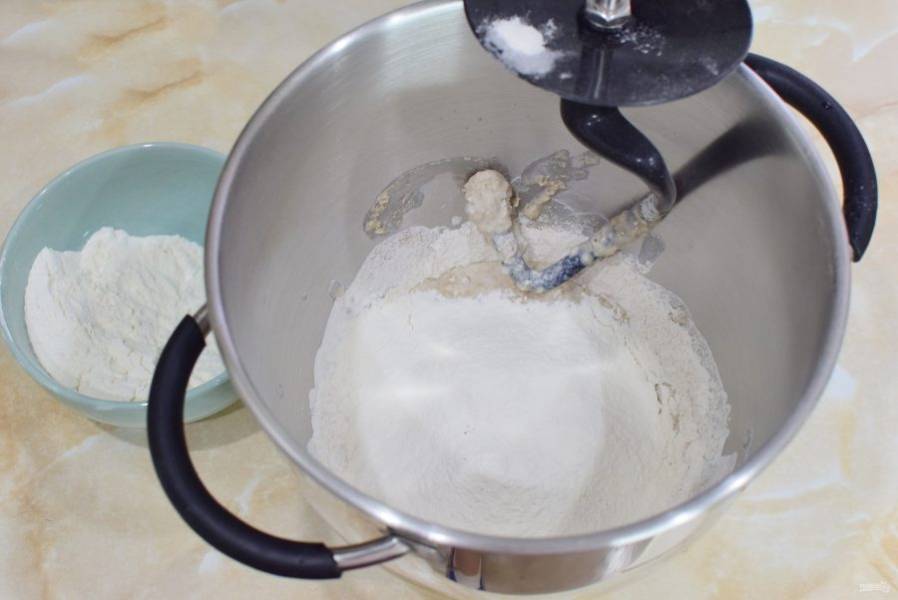 Затем всыпьте пшеничную муку. Но не всю. Четверть отложите.