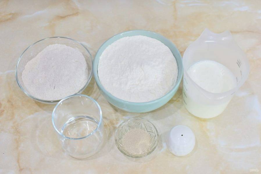 Для приготовления хлеба подготовьте все ингредиенты. Оба вида муки просейте через сито. Просеянная мука насыщается кислородом. Благодаря этому тесто будет лучше ходить и изделия будут более воздушные.