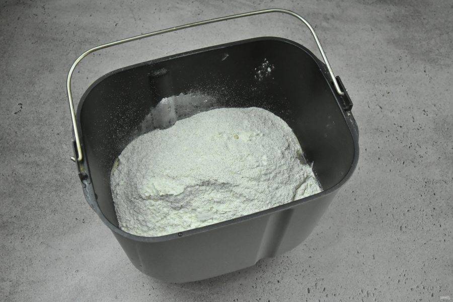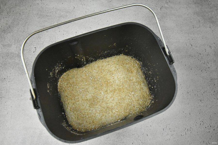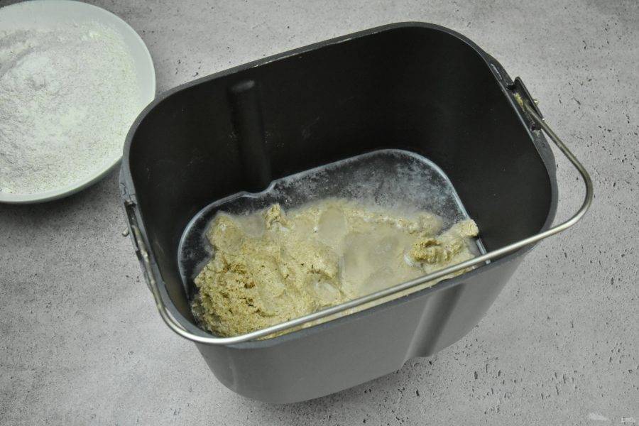 Из хлебопечки достаньте контейнер для дальнейшего замешивания теста. Установите лопатку для замешивания теста. Поместите в емкость всю готовую опару и 143 мл. воды. Обратите внимание на очередность закладки сухих и жидких составляющих теста, прописанную в инструкции к устройству.