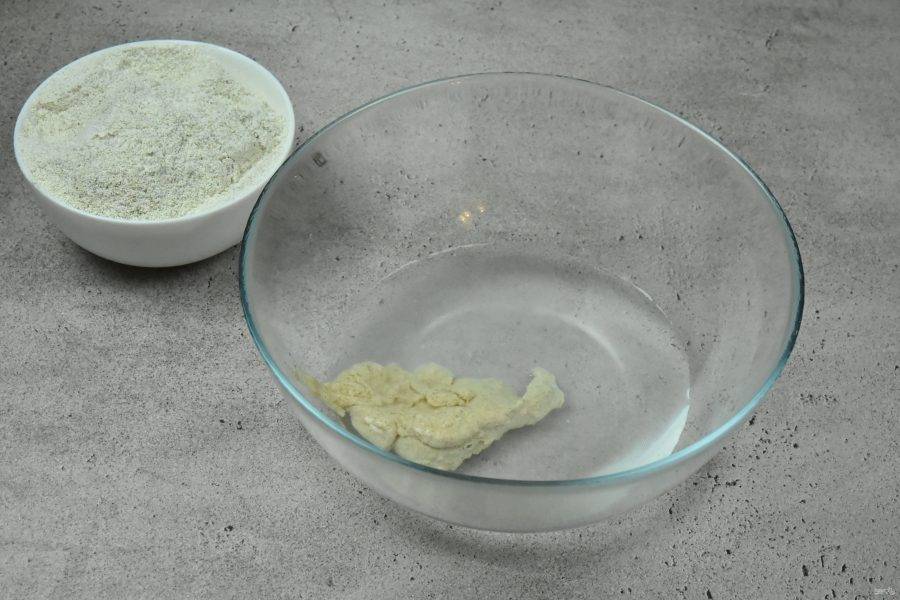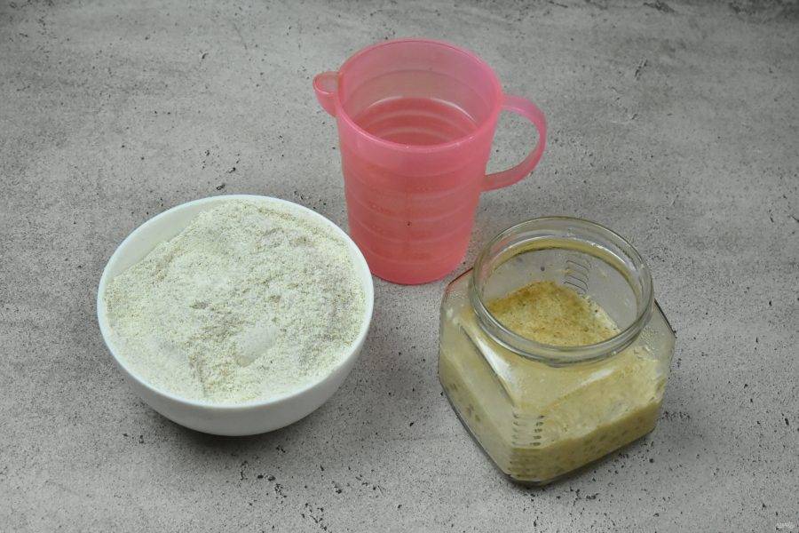 Закваску поместите в миску, влейте 100 мл. воды, размешайте смесь и всыпьте 130 граммов ржаной обдирной муки.