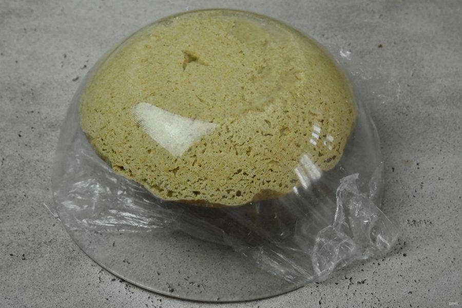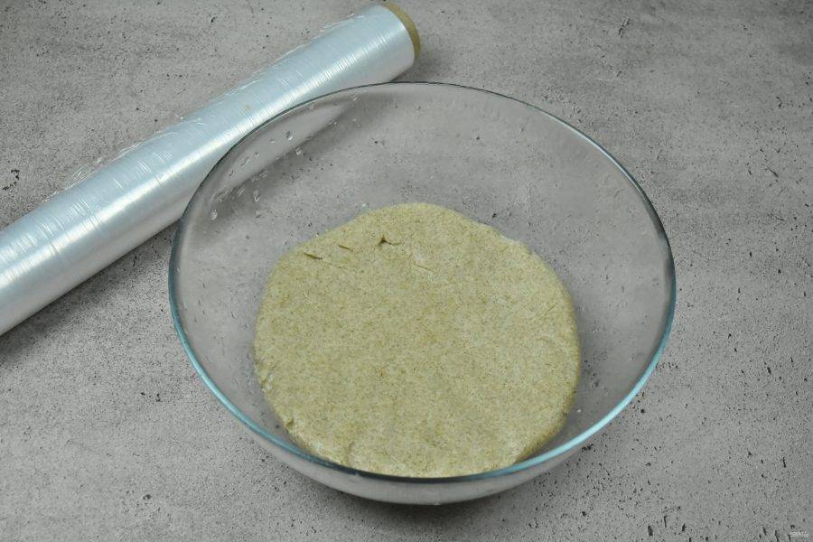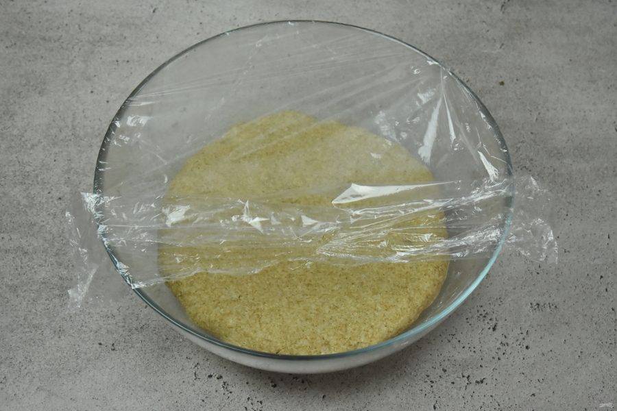 Разровняйте массу в миске влажными руками. Накройте посуду полиэтиленовой пленкой.