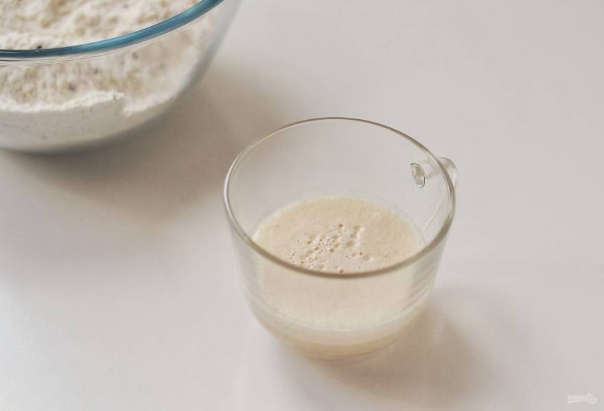 Дрожжи и сахар разведите в небольшом количестве теплой воды. Оставьте до тех пор, пока они не поднимутся.