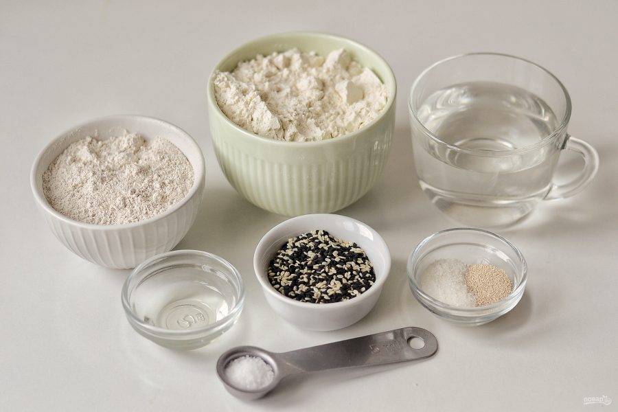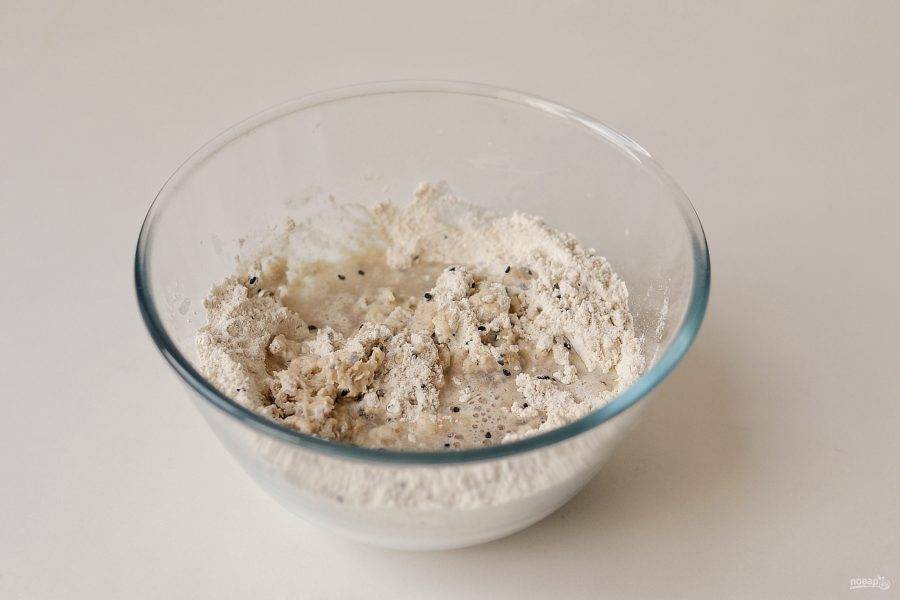 Просейте оба вида муки, добавьте соль и кунжут. Перемешайте.