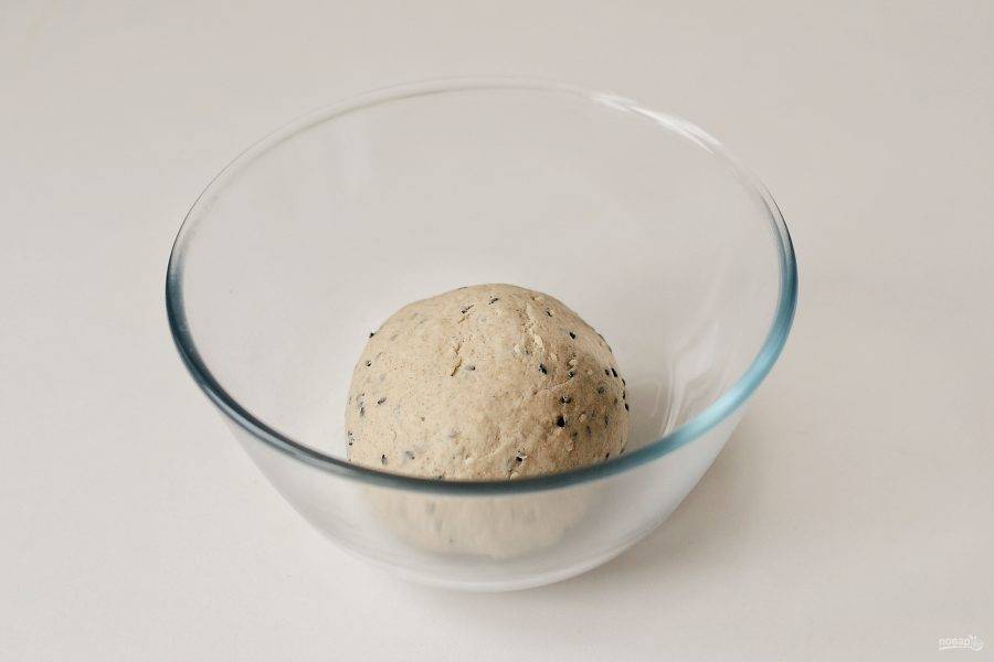 Смажьте миску растительным маслом, тесто сформируйте в шар. Накройте пленкой и уберите в теплое место на 40-60 минут, пока оно не увеличится вдвое. Затем добавьте в тесто оставшееся масло и вымесите.