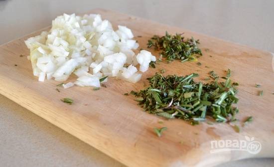 2. Очистите и измельчите лук, а также ароматные травы (тимьян и розмарин).