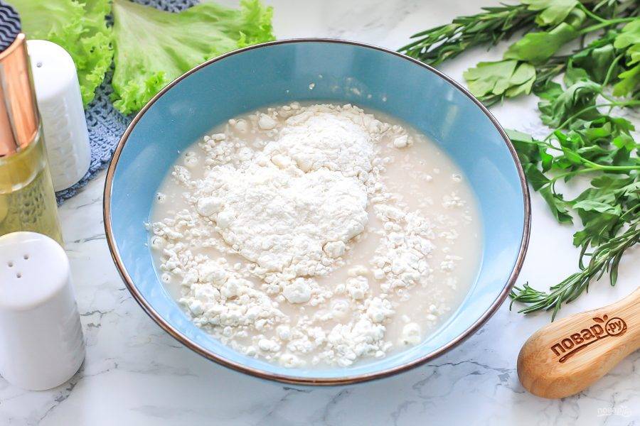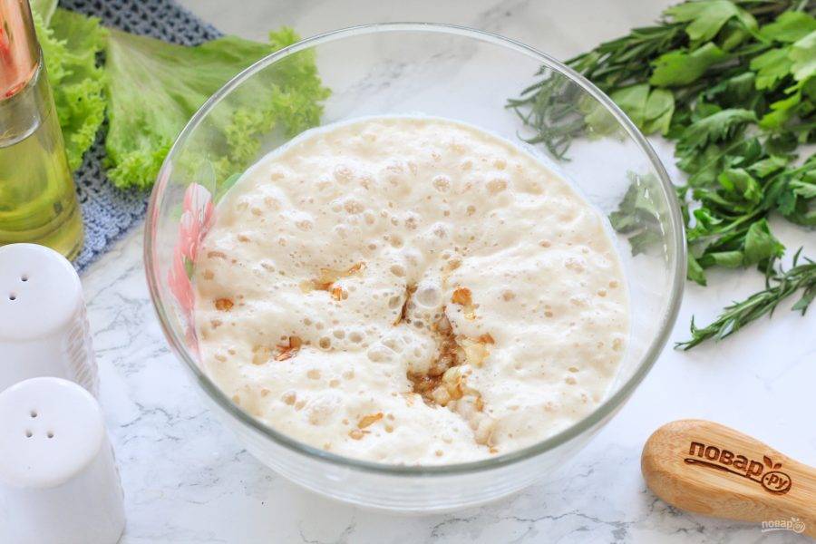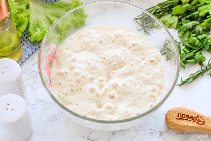 Влейте теплую воду и тщательно все перемешайте, чтобы и дрожжи, и сахар, соль растворились в воде. Всыпьте треть муки и тщательно вмешайте ее в жидкость. Накройте емкость полотенцем или крышкой и оставьте в теплом месте на 15-20 минут для создания опары.
