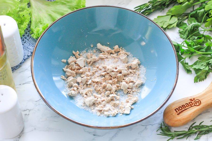 Свежие дрожжи раскрошите в глубокую емкость и перемешайте с солью и сахаром.