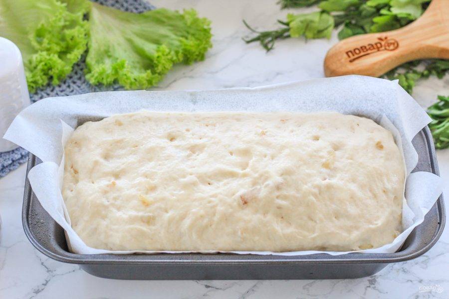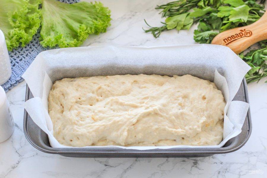 Застелите форму пергаментной бумагой и смажьте или сбрызните ее растительным маслом. Выложите в форму приготовленное тесто и оставьте на полчаса в теплом месте для расстойки, масса должна увеличиться в два раза.