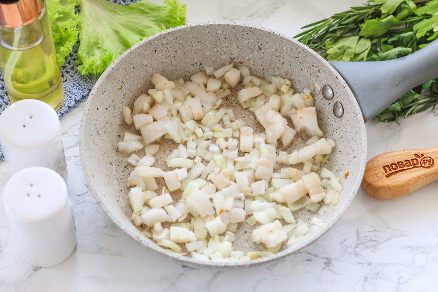 В это время очистите репчатый лук от кожуры и промойте в воде. Нарежьте мелкими кубиками, так же, как и шпик. Обжарьте на сковороде без растительного масла примерно 5 минут до румяности лука.