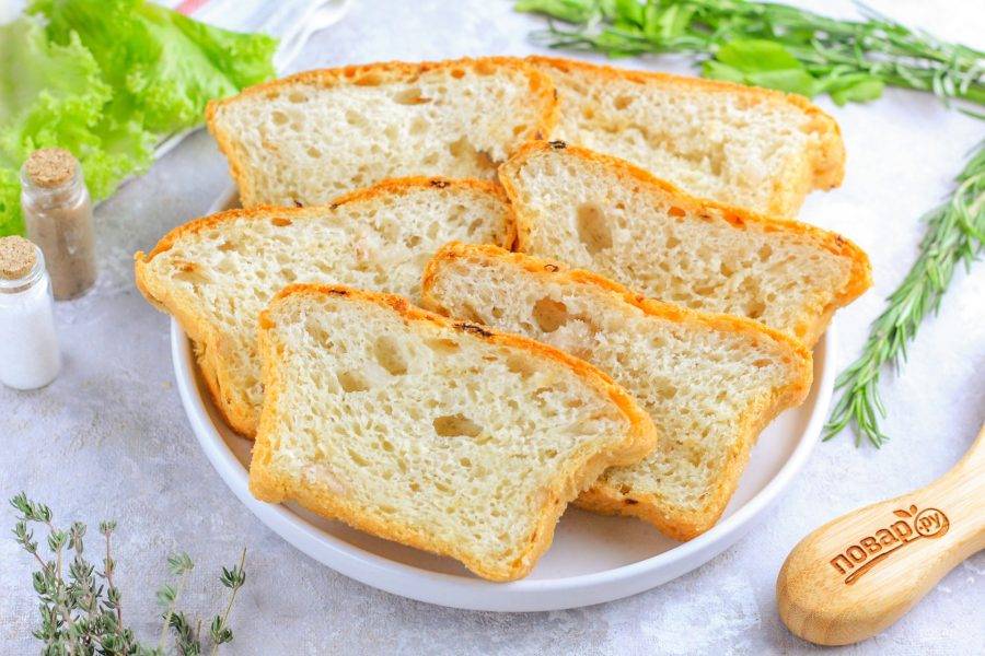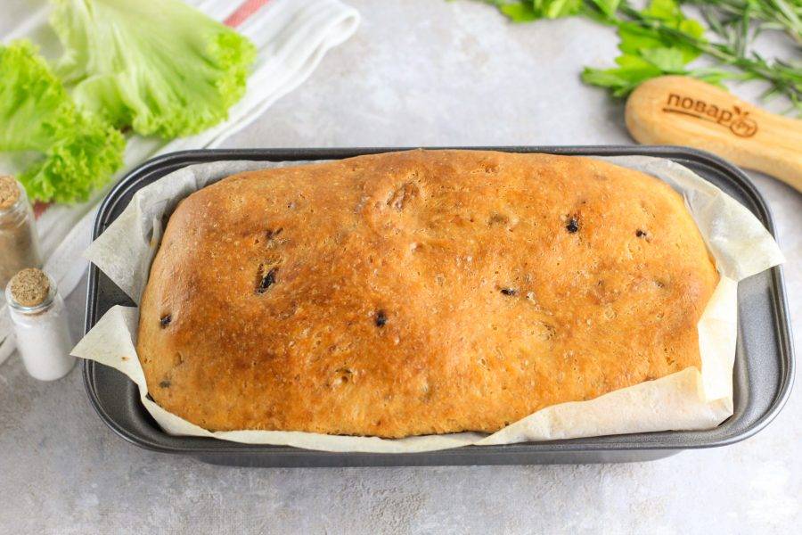 Готовый хлеб извлеките из формы и слегка остудите, если хотите подавать его теплым. Но чтобы он нарезался красиво, его нужно остудить полностью.