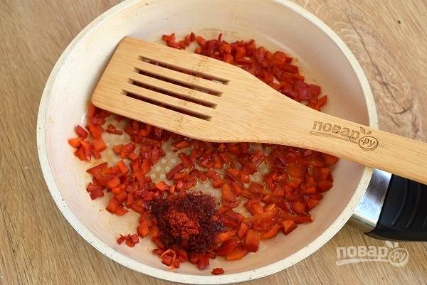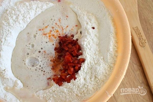 Дрожжи разведите с 100 мл воды и сахаром, поставьте в теплое место на 15 минут до поднятия пенной шапочки. Перец обжарьте до мягкости на разогретом оливковом масле (2 ст. л.), добавьте паприку, перемешайте, остудите.