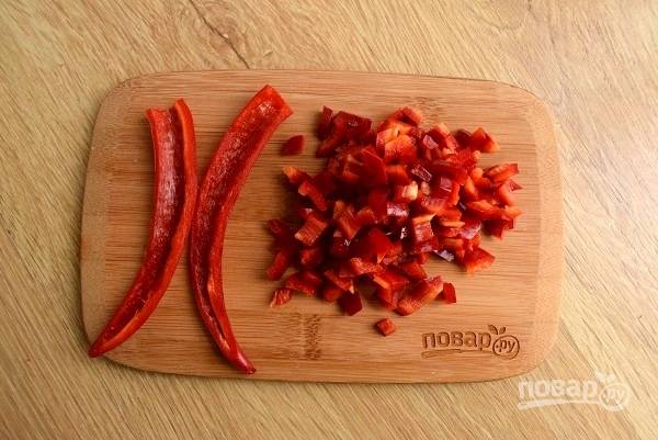 У перца удалите плодоножки, разрежьте вдоль, удалите семена, нарежьте мелкими кусочками.