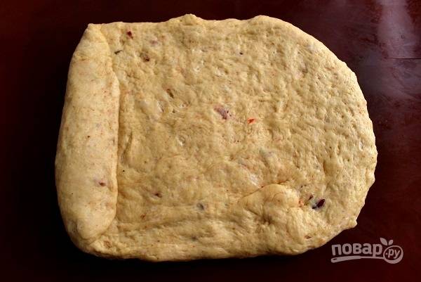 Рабочую поверхность присыпьте мукой, обомните тесто, раскатайте в пласт толщиной 1,5 см, сверните в плотный рулет. Защипните тщательно край, немного прокатайте.
