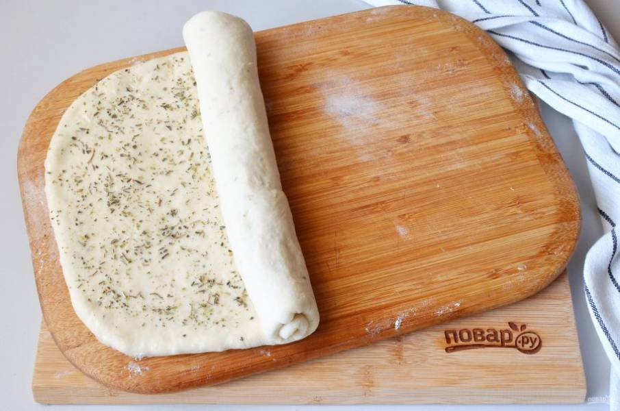 Помесите тесто несколько минут, раскатайте прямоугольником по ширине своей формы для хлеба. Притрусите оставшимися приправами.