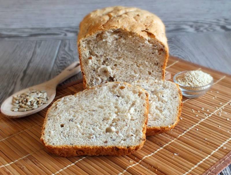Хлеб с семечками можно подать к завтраку или первым блюдам. Он имеет легкую структуру и отличный вкус. А поможет в его приготовлении — хлебопечка. Загрузим продукты и будем ждать результата. Готовим!