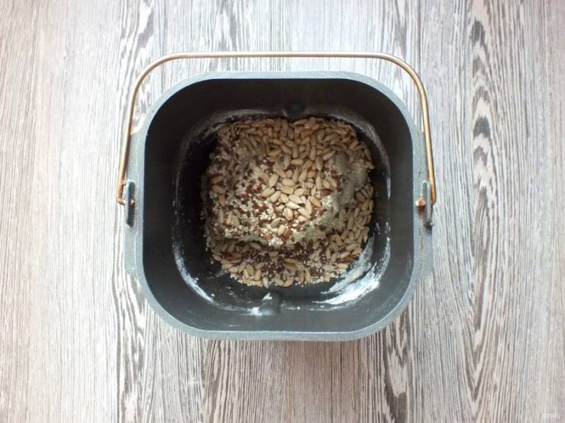 Как только тесто соберется в шар, добавьте семена подсолнечника, кунжут и 2 ст.л. растительного масла. Закройте крышку и дождитесь окончания процесса.