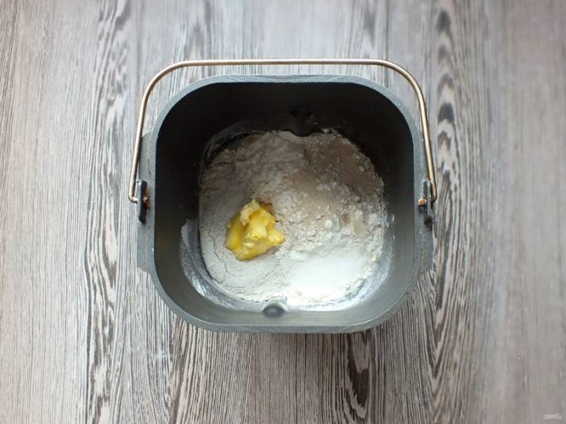 В ведерко хлебопечки поместите продукты согласно вашей инструкции. В моем случае идут сначала жидкие, потом сухие. То есть сначала теплая сыворотка, потом оба вида муки, мягкое масло, соль, сахар и дрожжи. Включите режим "Основной", по времени 3 часа 40 минут. Следите за процессом замеса.