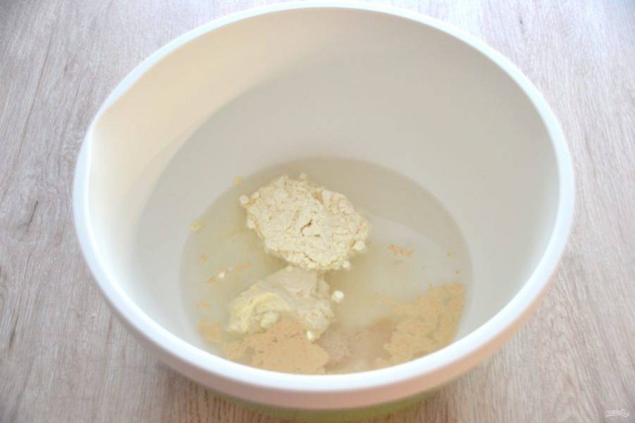 Чтобы "разбудить" дрожжи, влейте в емкость для замешивания теста теплую воду, добавьте сахар, закваску, сухие дрожи и пару столовых ложек муки, смешайте. Дайте постоять около 20 минут.