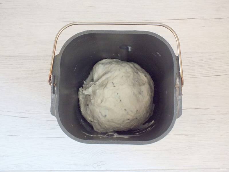 После того, как тесто начнет замешиваться, понаблюдайте за замесом. Тесто должно замеситься в однородный комок, оно слегка липнет, но не растекается по ведерку. Если тесто жидковатое, добавьте немного муки, до необходимой консистенции. После крышку закройте и дождитесь окончания программы.