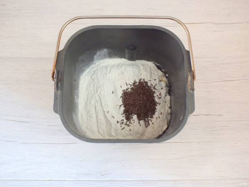 Добавьте муку, тмин. Включите программу "Французский хлеб", время 4 часа, с прогреванием продуктов.