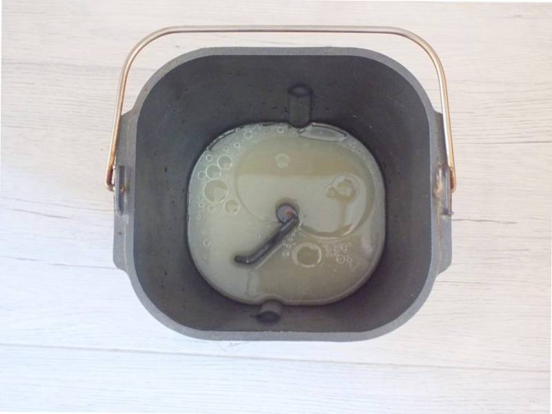 В ведерко хлебопечки перелейте сыворотку с дрожжами. Добавьте растительное масло.
