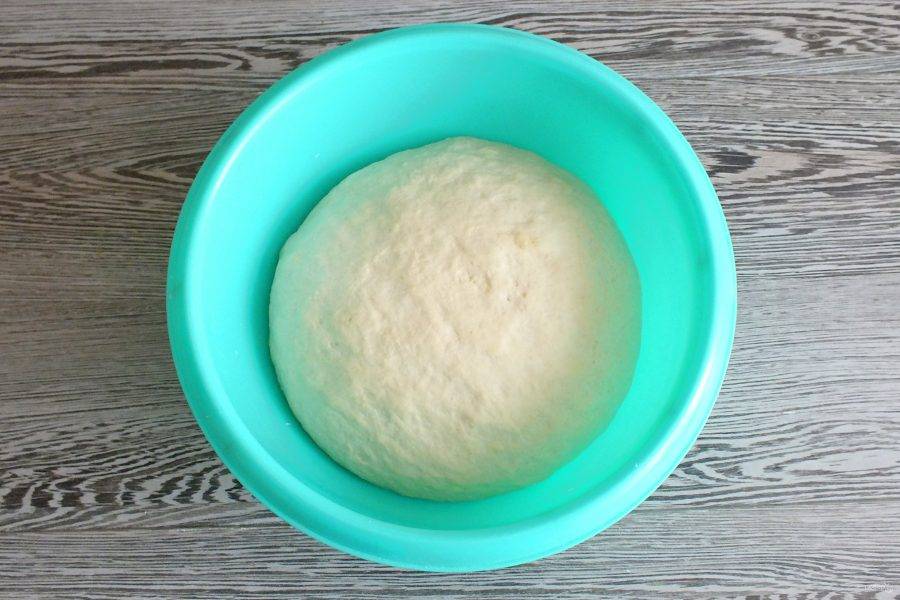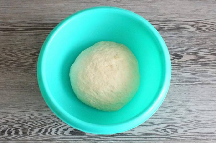 Готовое тесто округлите, выложите в чашу, прикройте пищевой плёнкой и уберите на 40 минут в тёплое место без сквозняков.