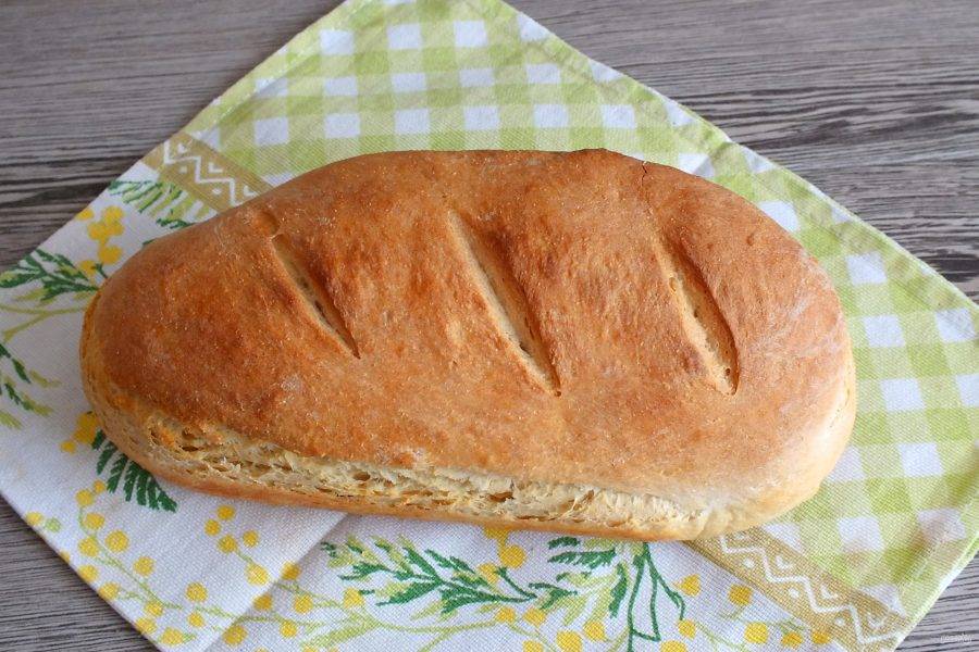 По истечении времени проверьте готовность хлеба. Он должен быть бледно-румяного цвета, с корочкой. По которому если постучать, будет глухой звук. Хлеб достаньте из формы. Заверните в полотенце и оставьте на 6-8 часов при комнатной температуре.