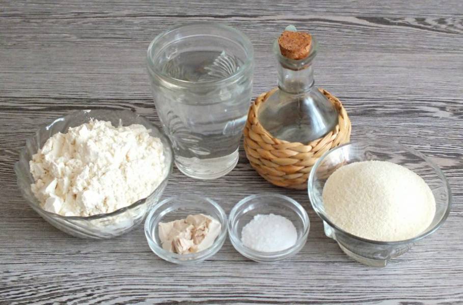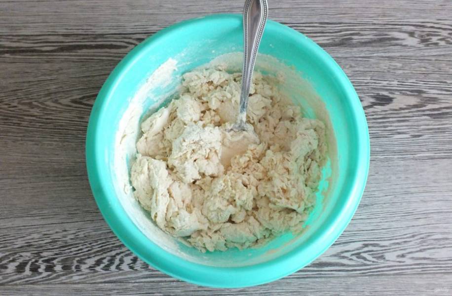 Уксусный и солевой раствор добавьте в чашу с замешиваемым тестом. Перемешайте ложкой. После месите руками. Тесто будет изначально липнуть, но постепенно станет "послушным". Если это не происходит, смажьте руки растительным маслом, так удобнее будет месить тесто.
