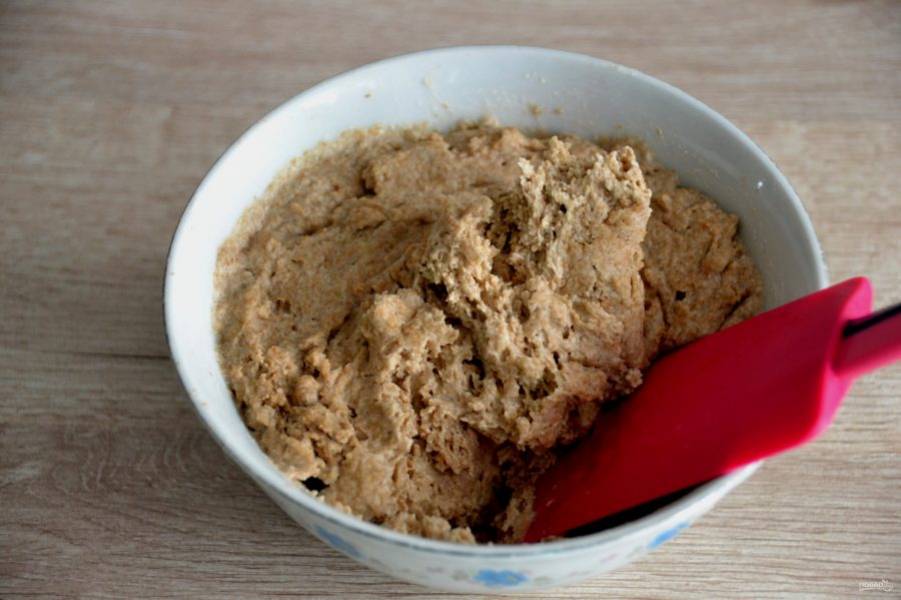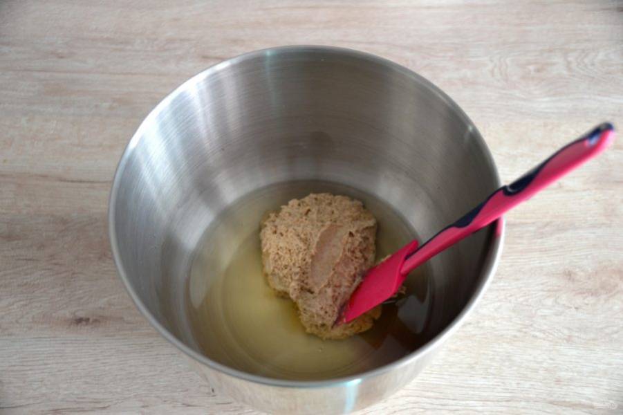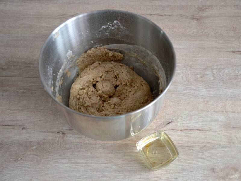 Замесите тесто. В последнюю очередь влейте растительное масло, вмешайте масло в тесто.