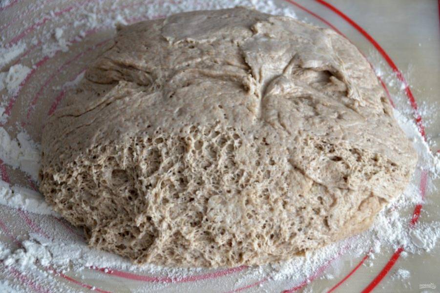 Присыпьте рабочую поверхность стола мукой, выложите тесто. Тесто больше не вымешивайте, не забивайте его мукой, просто сформируйте хлеб.
