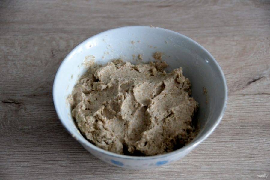 Смешайте теплую воду, ржаную закваску и муку. Накройте пищевой пленкой, поставьте в теплое место для брожения на 18-20 часов, можно чуть больше.