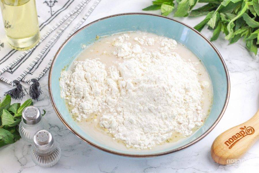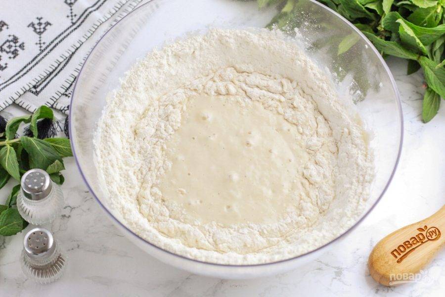 Всыпьте 120-150 граммов пшеничной муки высшего сорта и замесите опару — она должна получиться вязкой.